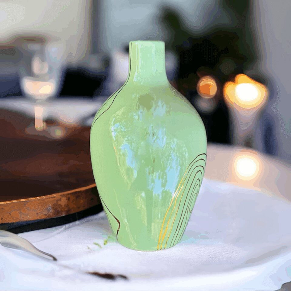 Anfora anulare artigianale verde ramina con decorazioni in oro. Ceramica d’arte Grottega, design contemporaneo e tradizione italiana.